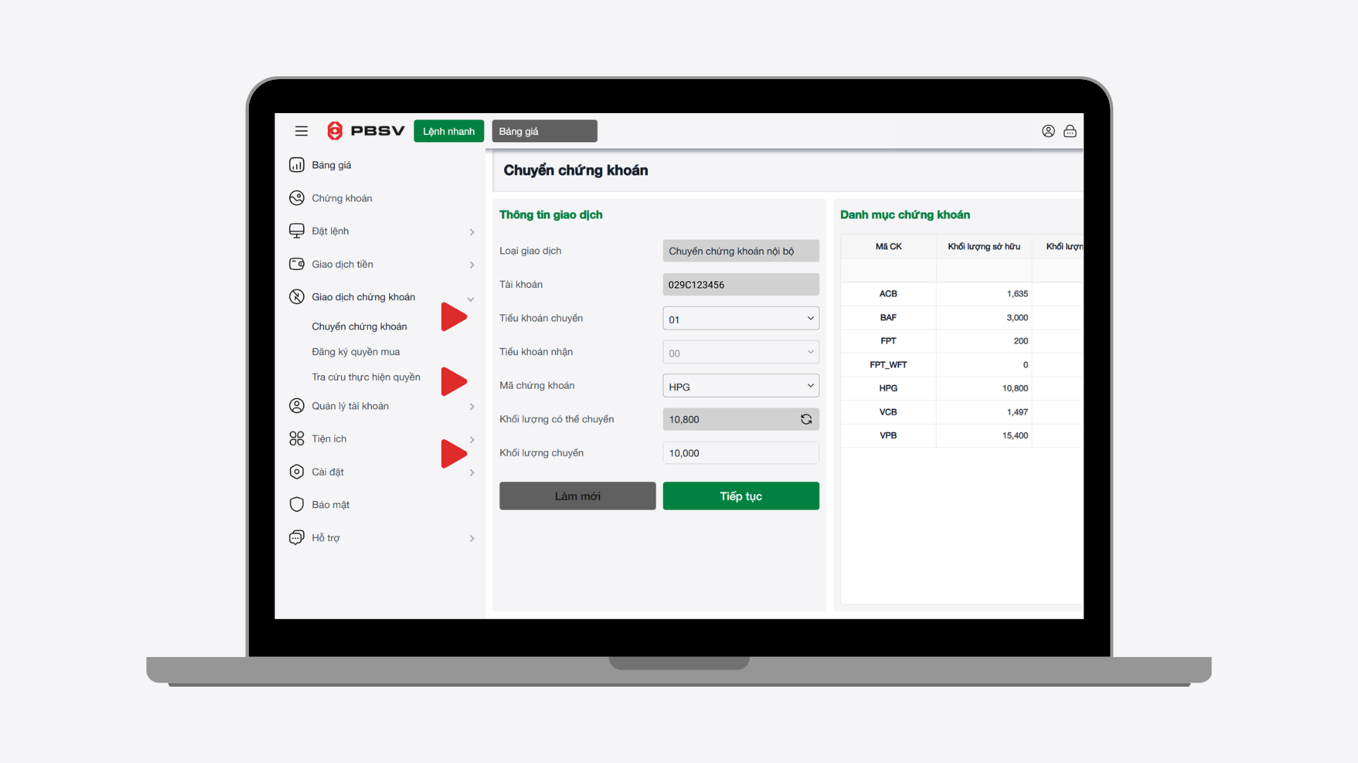 Các bước chuyển chứng khoán trên PBSV Web Trading