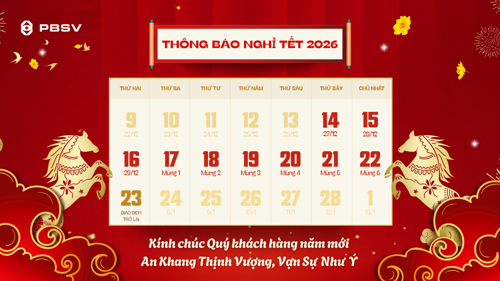 Thực hiện theo thông báo của Sở Giao dịch Chứng khoán Hà Nội, Sở Giao dịch Chứng khoán TP. Hồ Chí Minh và Tổng công ty Lưu ký và Bù trừ Chứng khoán Việt Nam, PBSV xin trân trọng thông báo đến Quý Khách Lịch nghỉ Tết Nguyên Đán 2026 như sau: